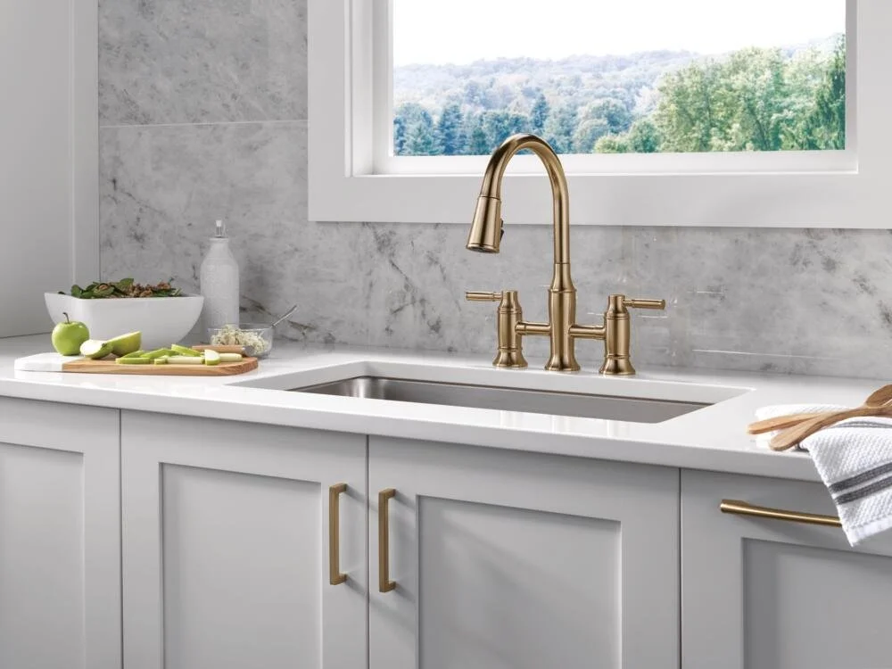 Delta Renaldi Two Handle Pull-Down Bridge Kitchen Faucet in Lumicoat Champagne Bronze