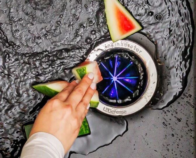 The industry's first and only garbage disposal sink flange accessory with 24/7 odor fighting LED technology. InSinkErator LEDefense Technology Kills 99% of odor-causing bacteria, combating the smell that comes from bacteria forming as a result of food waste in your sink.