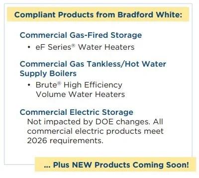 Bradford White currently has commercial water heating products available that are compliant with these new requirements, and are expanding their high-efficiency commercial offerings. Stay tuned for the latest developments regarding these regulations and future product launches that meet the updated regulatory requirements.