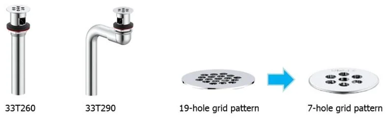 In addition, all drains with open grid strainers now feature a 7-hole pattern. This change affects 33T260 and 33T290 inline and offset drains, both of which are transitioning from a 19-hole to a 7-hole open grid pattern.