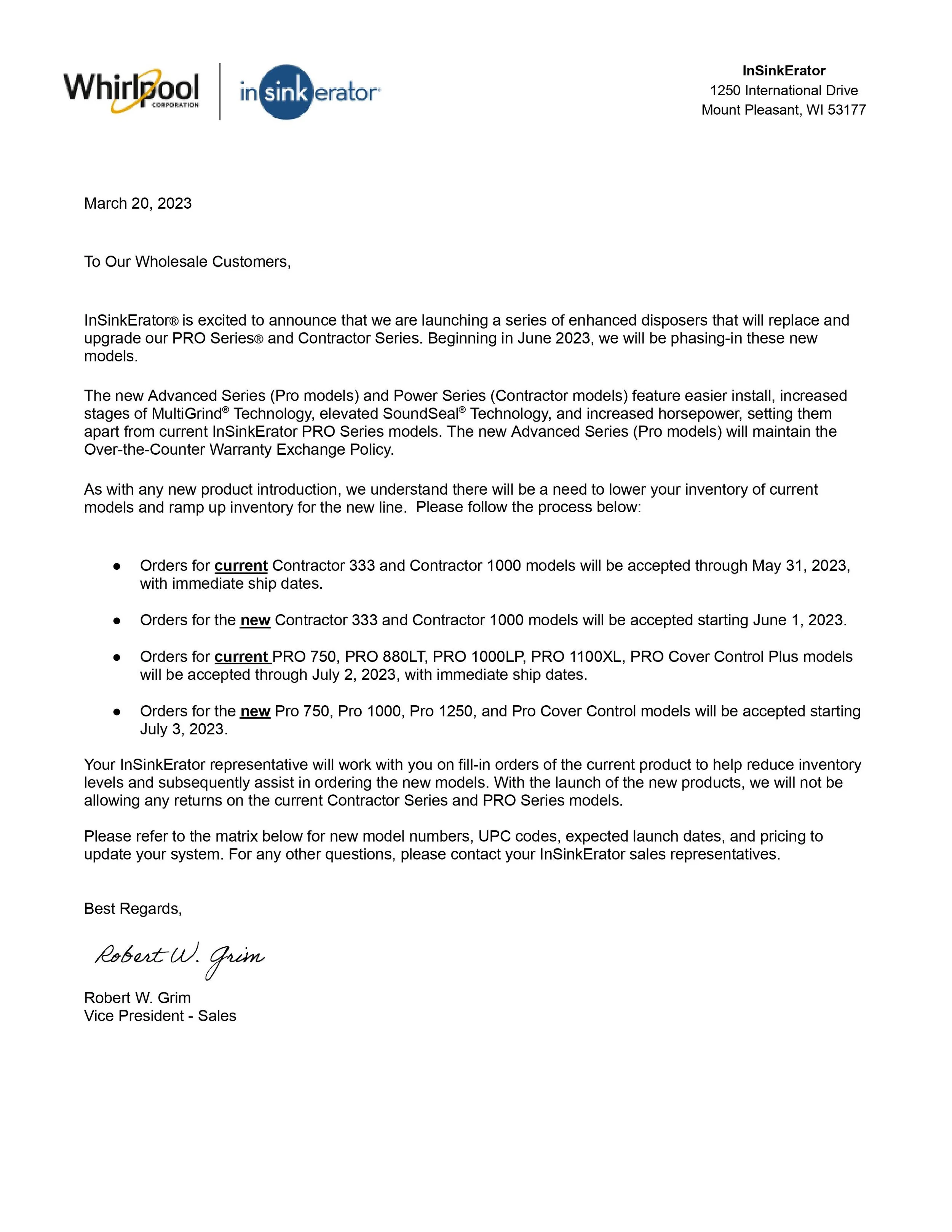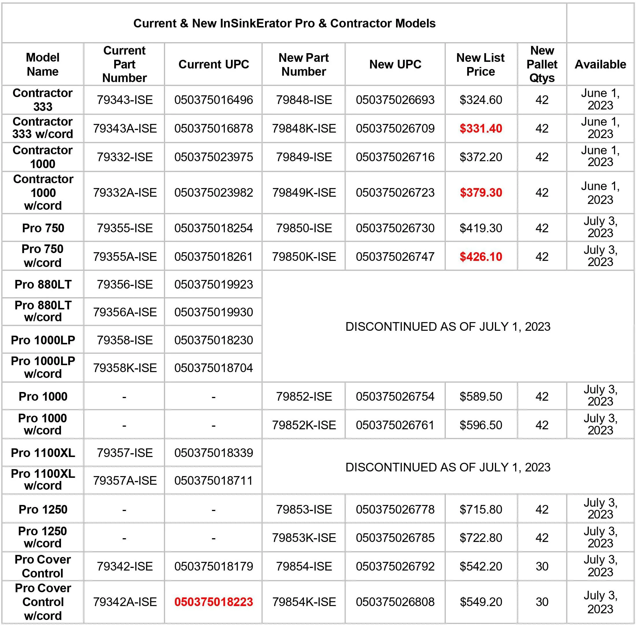 As the Advanced Series and Power Series are direct replacements for the PRO Series and Contractor Series, we advise our customers to begin planning for the adjustment of ordering and inventory accordingly. InSinkErator has provided the following timelines: