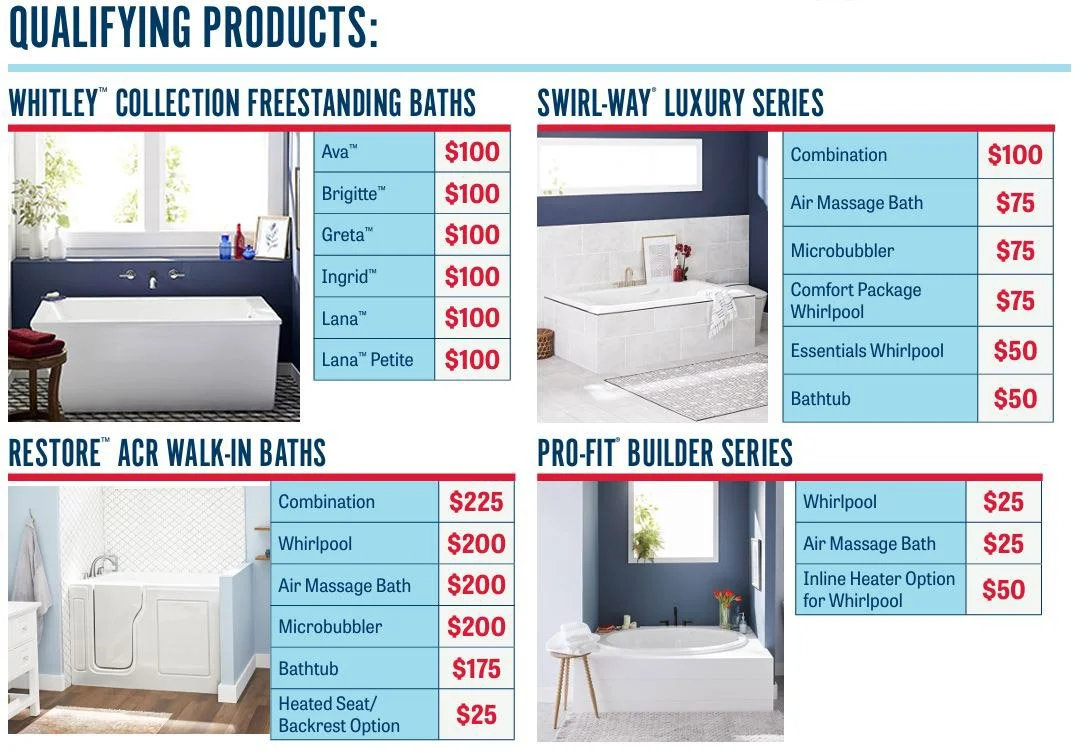*See additional terms and conditions and the full list of qualifying products on www.awardlink.com/mansfieldbath. Questions about the program, website or claims submission? Contact the program administrator at mansfieldbath@spihq.com.